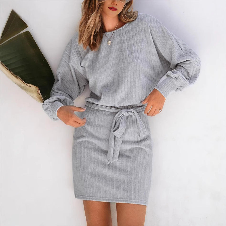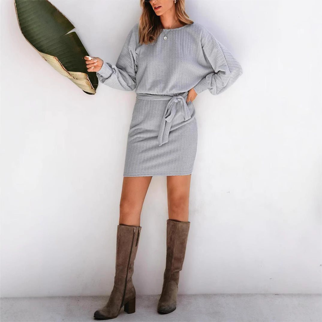 Belt Decorative Long Sleeve Sunken Stripe Woolen Knit Dress